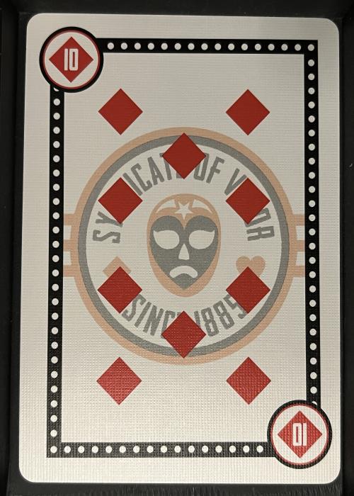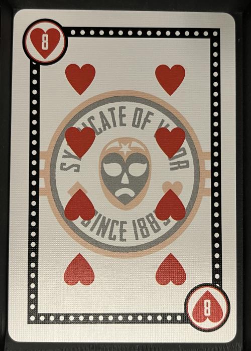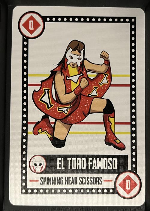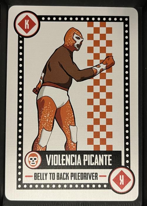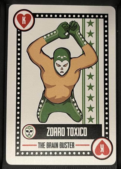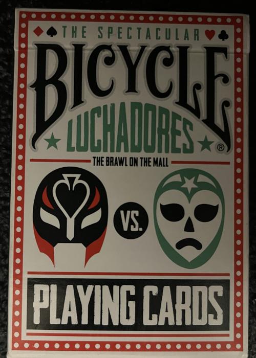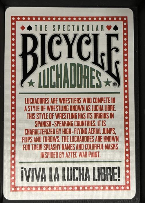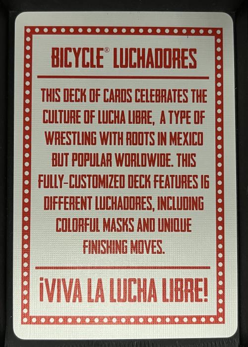 This deck celebrates the culture of Lucha Libre, a type of wrestling with roots in Mexico but popular worldwide. Luchadores is the term for the wrestlers themselves. Colorful masks, high-flying maneuvers and rapid sequences of holds are common characteristics of Mexican wrestling. This fully-customized deck features 16 different Luchadores, including colorful masks and unique finishing moves. Hand-drawn number cards, court cards, and Jokers. Bicycle® decks are made in the USA and feature the patented Air-cushion® Bicycle finish, softly beveled edges and sandwich construction for enhanced game play.