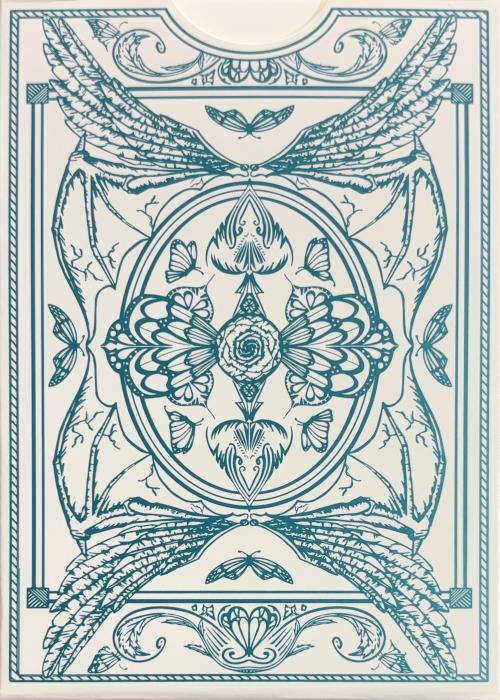 Papilio Ulysses V3 Playing Cards (printed by US Playing Card Company) encourages all who hold this amazing deck to experience its beauty and "Alis volat propriis" - Fly with your own wings. When in flight, the female Ulysses butterfly can be seen hundreds of meters away as sudden bright blue flashes. In honor of this phenomenon, metallic blue and gold ink is strategically speckled throughout the deck on the tuck case, card backs, court cards and Jokers. The value and quality of Papilio Ulysses Playing Cards is undeniable. Every card was thoughtfully modified to represent the stages of metamorphosis and flight. Each of the court cards are customized with royal beauty and class. The numbered cards delightfully include a customized pip, while retaining the familiar design of the key indices. The simple white and metallic blue tuck case cocoons the beauty and the unique color of the deck inside. The tuck also fittingly includes a prediction element for magicians.