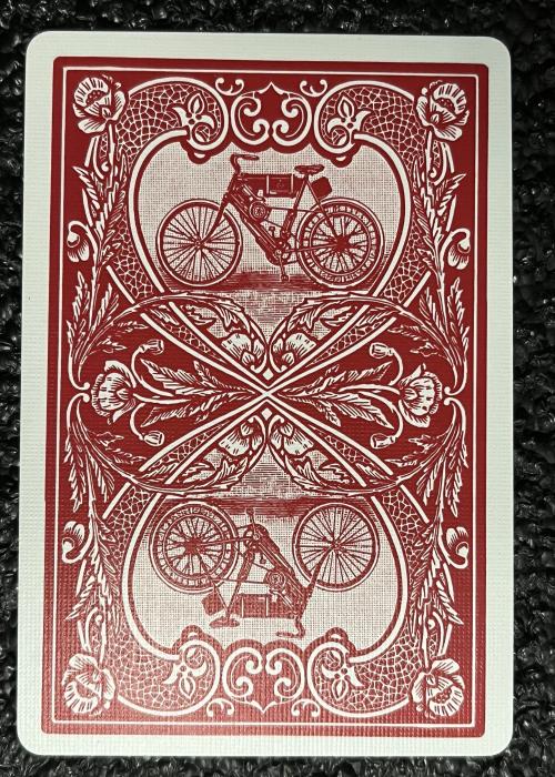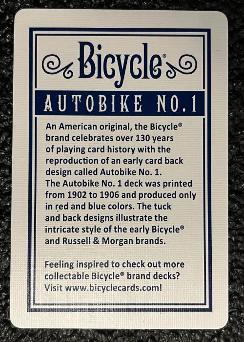 Bicycle and U.S. Playing Card Co. celebrate over 130 years of playing card history with the reproduction of an early card back design called AutoBike No. 1. The original deck was printed from 1902 to 1906 and produced only in red and blue colors. The tuck and back designs illustrate the intricate style of the early Bicycle and Russell & Morgan brands, a feature an early version of a motorbike.
