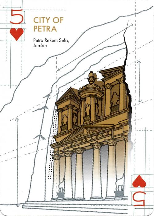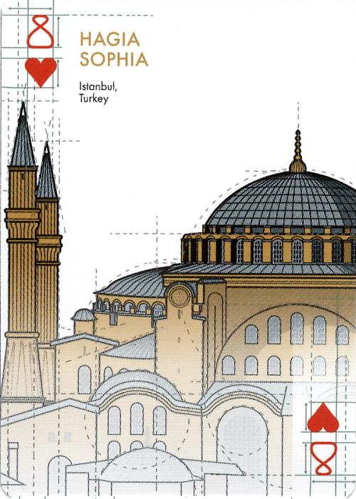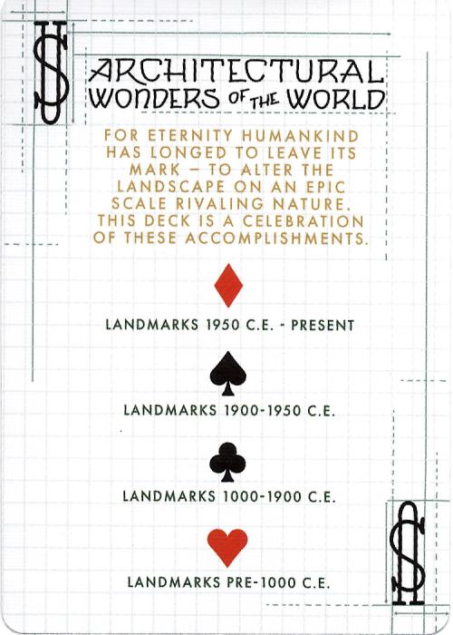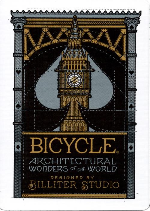 Amazon exclusive - Bicycle architectural wonders of the world is a celebration of the great works of architecture throughout history as seen through the eyes of an artist who truly appreciates beautiful structures. Each card front showcases a hand illustrated, famous piece of architecture from across the globe. When all stacked up, the deck is an exploration of 54 of the world's most marvelous structures. The Bicycle Architectural Wonders of the World package contains embossed details and foil that further accentuate the beauty of the deck. 54 hand illustrated architectural marvels from across the globe, custom Ace of Spades and unique card back design. Premium embossed and foil package. Classic air-cushion finish for ease of shuffling and optimum performance Full Deck Scan: https://cardscans.piwigo.com/index?/category/153-bicycle_architectural_wonders