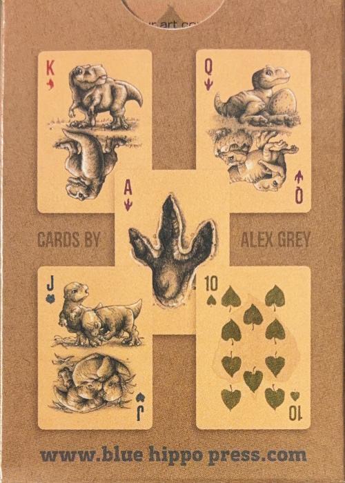 The Hatchlings deck is a standard playing card deck, but filled with dinosaur-cuteness. The distinct colors and suits make it easy for anyone of any age to pick them up to play . . . whether it's for a game of Poker with friends, Go Fish with the kids, or Solitaire on your own! Fans of art decks will enjoy the illustrated court cards. Every Hatchling illustration is a look at baby dinosaurs doing what they love to do. They are hand drawn with pencil and charcoal, on recycled tan paper. Every court card features two unique illustrations of a baby dinosaur. See a baby Allosaurus dutifully watch over a little egg . . . then flip the card over to see his reaction when his new baby brother hatches! Pips and aces are hand-drawn and designed to fit their dinosaur companions. Herbivores are represented with leaves and eggs, carnivores with claws and footprints. Simple silhouettes and bold colors make every card and suit easily distinguishable. The card backs star everyone's favorite theropod, the Tyrannosaurus rex, popping out to say hi in an egg-shaped window. A custom designed tuck box gives a cozy place to (as the name suggests) tuck your baby dinosaurs in at the end of the night. Two different pterosaurs sneak their way into the deck as the joker cards. The cards will be printed by the US Playing Card Company, in (you guessed it) the United States! The cards are standard poker size, printed on a premium 325gsm card stock with a lovely linen finish. The cards have a beautiful hand-made look, with casino-quality sturdiness. Hatchlings decks are eco friendly, too. USPCC uses sustainable forest paper, starch-based laminating glue, and vegetable-based inks. The cards and box are completely recyclable. KickStarter: https://www.kickstarter.com/projects/alexgrey/hatchlings-illustrated-playing-cards Full Deck Scan: https://cardscans.piwigo.com/index?/category/548-hatchlings