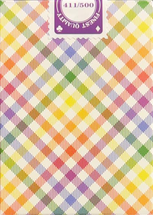 Rainbow Plaid playing cards bring a fun & stylish flair to the card table. The back design takes a classic plaid pattern into the modern age by incorporating the colors of the rainbow. The borderless back design makes Rainbow Plaid an amazing fanning deck - offering 4 different looks depending on which way you fan the cards. The Rainbow Plaid deck introduces Penguin's brand-new custom standard faces designed by Anna Lukavska and Kevin Reylek, plus a fully custom Ace of Spades and Jokers. A double-backed card and a blank card are included for magic tricks. The bold, fun tuck box has custom printing inside and out and is topped off with an individually-numbered sticker seal. Rainbow Plaid playing cards are printed using Penguin's signature UltraLux™ Finish and AquaFlow™ Coating. The casino-grade European card stock and perfect linen texture deliver a deck that handles like an absolute dream. The cards are traditionally cut with smooth edges that provide just the right amount of grip. Printed with vegetable-based inks and water-based coating, the cards are planet-friendly as well! These cards are soft enough to get to work straight out of the box, but durable enough to meet the needs of a full-time magician, cardist, or card sharp. Only 500 of these limited-edition decks have been printed. They are currently available only through special promotions and giveaways and are not available for purchase. •Ultra limited - only 500 decks printed •100% custom artwork, featuring Penguin's brand-new custom standard faces •UltraLux™ Finish with AquaFlow™ Coating •Traditionally cut •Tuck box printed inside & outside •Individually-numbered sticker seal •2 gaff cards included