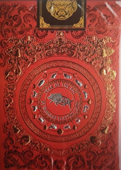 This series takes as reference the relationship between the nomads of Xiongnu in ancient Northern Asia and the well-known Chinese lunar calendar represented by 12 animals. In this calendar each animal is related to the lunar year of birth and also marks, according to its beliefs, the destiny of each person. Since a series of 12 decks would be too ambitious for a single project, we decided to launch the first deck dedicated to the PIG year (2019) and then to continue within a year. About the Deck: Cards have been beautifully illustrated combining ancestral and modern techniques. The original drawings have been created with a Buddhist painting technique called “nagtan”. This technique uses dark backgrounds and luminous brush strokes. The digital treatment of these illustrations eliminates the dark backgrounds to achieve cleaner and more colorful cards. Each deck has been customized according to the animal it represents. Thus, the court cards show animals with human aspect and dressed in colorful period costumes. The faces are full of details. Each deck also includes texts with relevant aspects for each sign such as positive and negative colors, lucky numbers, matching signs and enemies, etc… In addition, each deck will have four jokers for joker collectors. Features: Embossing for tuck boxes for both editions 2 foils (Red, Gold, Silver) for tuck boxes for both editions German premium black soft-touch cardstock for LIMITED tuck box Italian pearlescent colored (red) cardstock for STANDARD tuck box Spot UV glossy varnish for LIMITED EDITION tuck box Numbered seals for LIMITED EDITION decks High quality German card stock for cards Pantone metallic ink for card backs All courts are drawn by hand 56 poker sized playing cards (52 cards+4 jokers) 4 jokers in every deck for joker collectors Printed by NPCC with premium linen finish A Double-deck jacket will be followed each 2 decks free (included in stretch goal) KickStarter: https://www.kickstarter.com/projects/nomadscard/year-of-the-pig-lunar-zodiac-playing-cards-1-of-12 Full Deck Scan: https://cardscans.piwigo.com/index?/category/75-year_of_the_pig