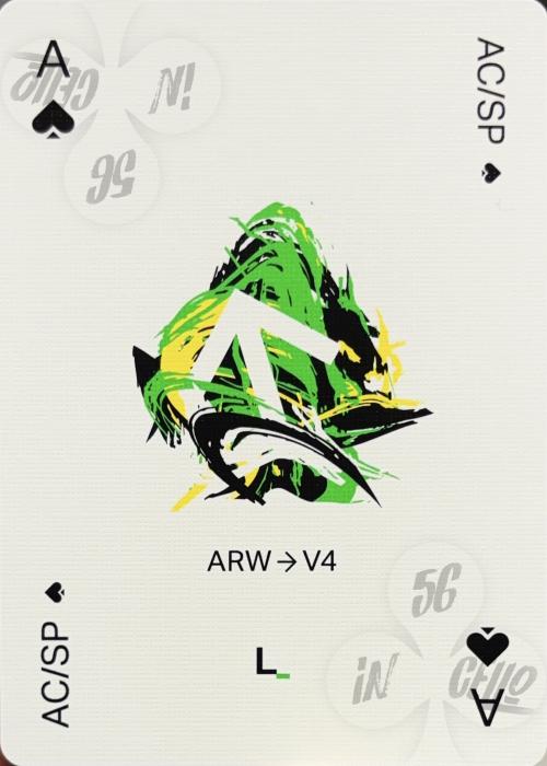ARW V4 explores the direction of flowing liquid, it's time to go with the flow. The card back of V4 uses a 2-way design so despite it's detail in the paint swirls, is symmetrical. The iconic ARW arrows set in white against a combination of two neon inks, yellow and green, which then contrast amongst the swirling black background.