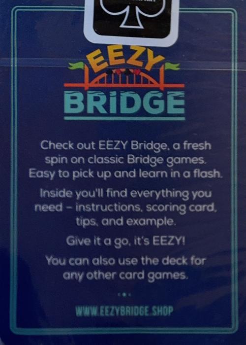 Designed to simplify the classic Bridge card game, EEZY Bridge requires no lessons to start. The deck includes 52 playing cards, 2 Jokers, an instructions and hints card, and a scorecard.