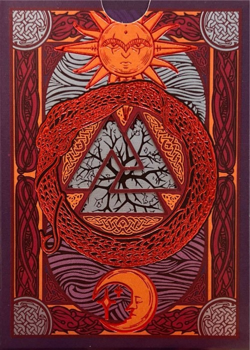 Top-notch luxurious craftsmanship, combined with the exquisite design of the artist and the magnificent legends of Norse mythology. What kind of unparalleled work can be presented? This is our answer. Welcome to The Norse Myths Series. Three decks in the series that explores the rich stories of Norse mythology through decks of playing cards, expert craftmanship and beautiful foiling. Fenrir, the monstrous wolf in Norse mythology, is a child of Loki destined to kill Odin during Ragnarök. Bound by magical chains, he breaks free at the end of days, symbolizing chaos and destruction. His fearsome strength terrifies even the gods.