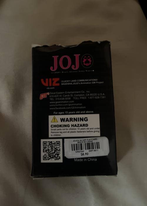 A 54-card deck for part 5 of Jojos Bizarre Adventure: Golden Wind. It has a unique character with their name on each of the 52 cards. There is also one black and one red joker card that have the same photo.