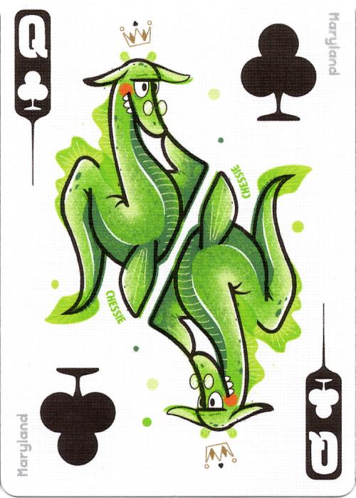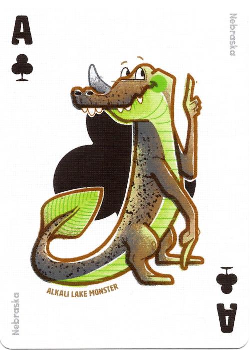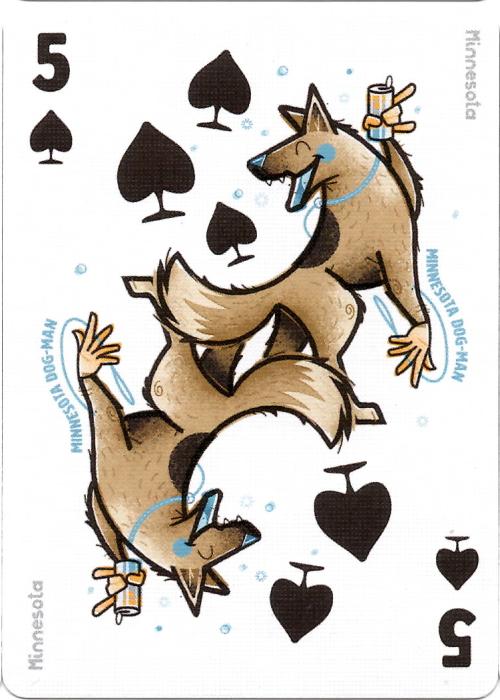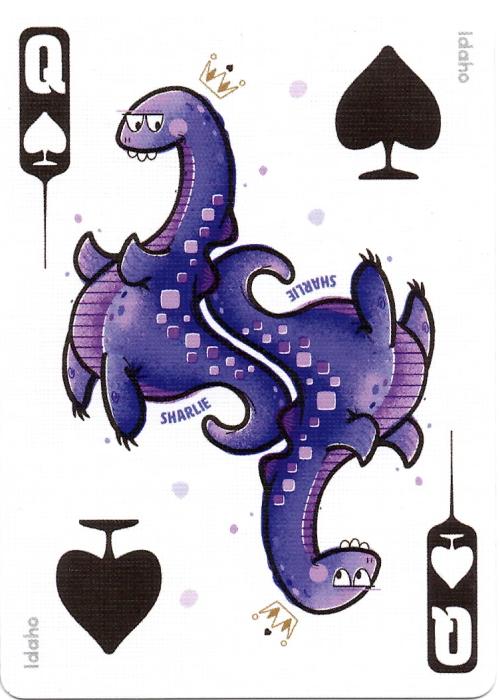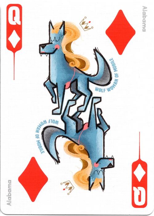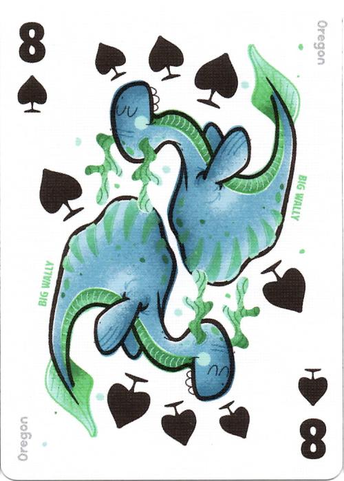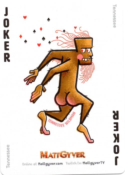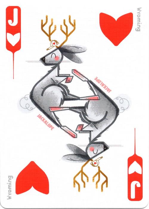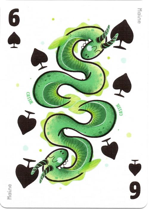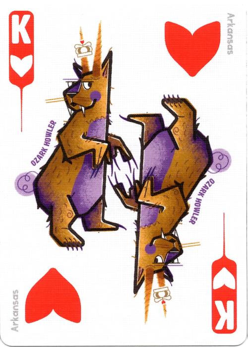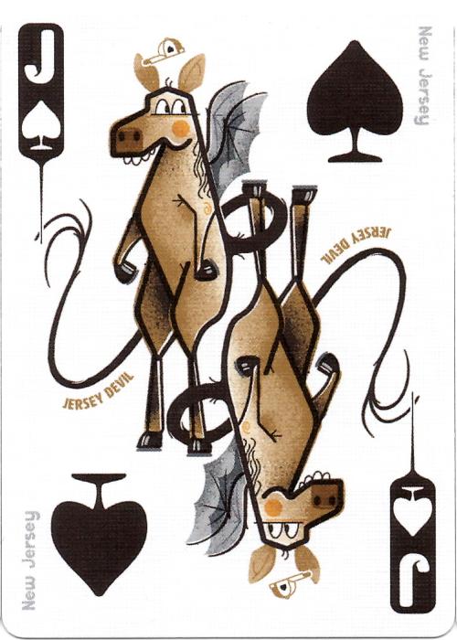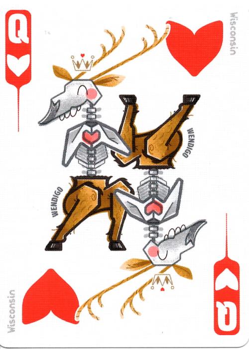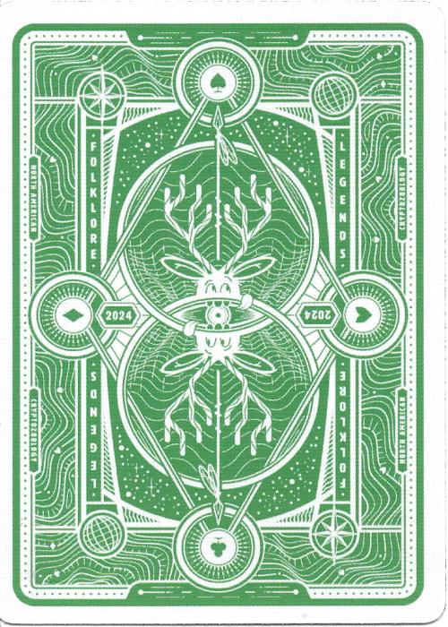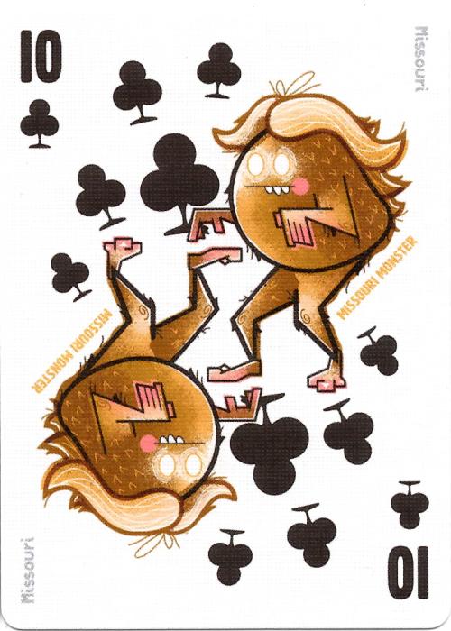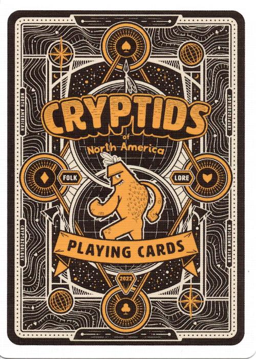 A lovingly illustrated poker deck of 54 cryptids from North America, representing all 50 United States and parts beyond. Each cryptid illustration is named and placed by state, rendered in bold color, and playfully arranged among the pips. Decks come in a die cut, handmade, 80lb cardstock tuck box stamped in gold ink and wrapped in twine; reminiscent of a field journal filled with illustrated identification cards.