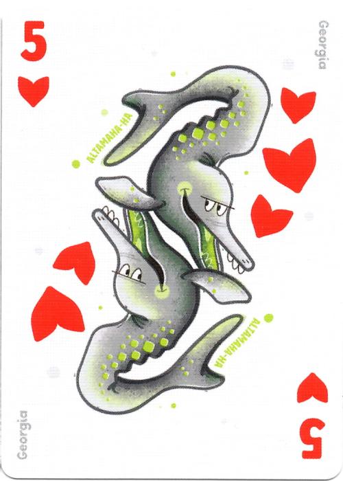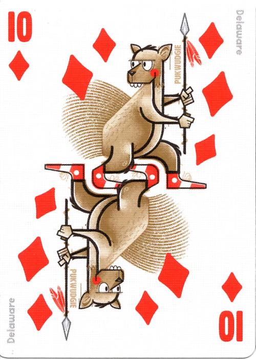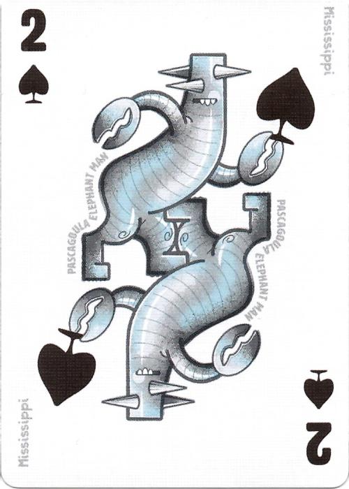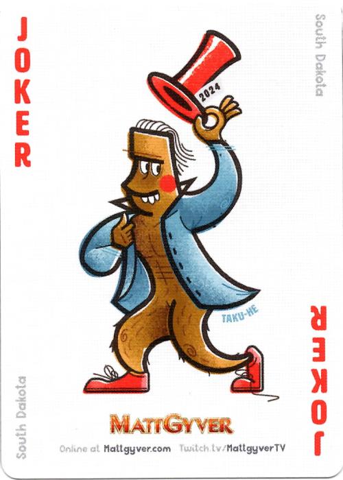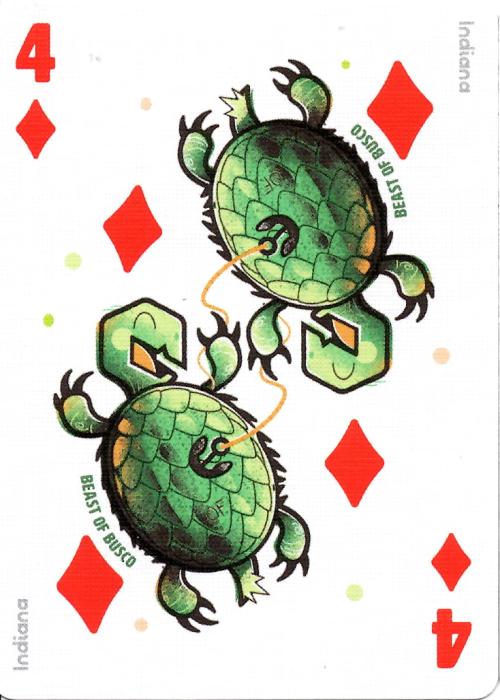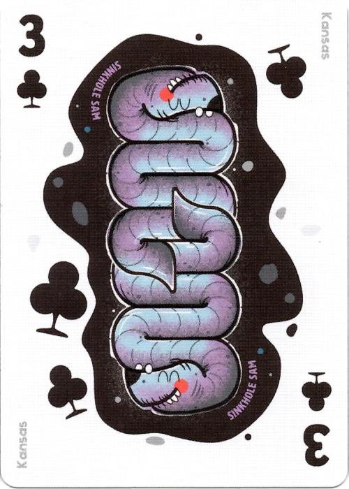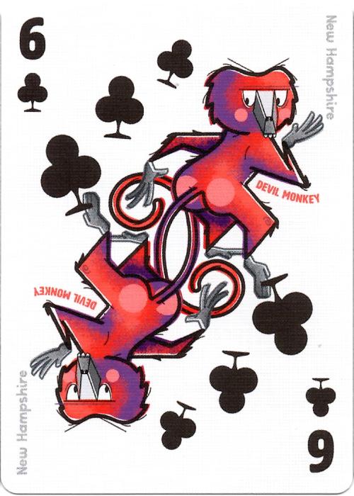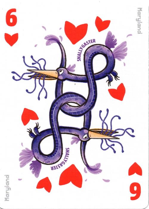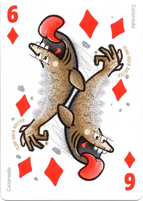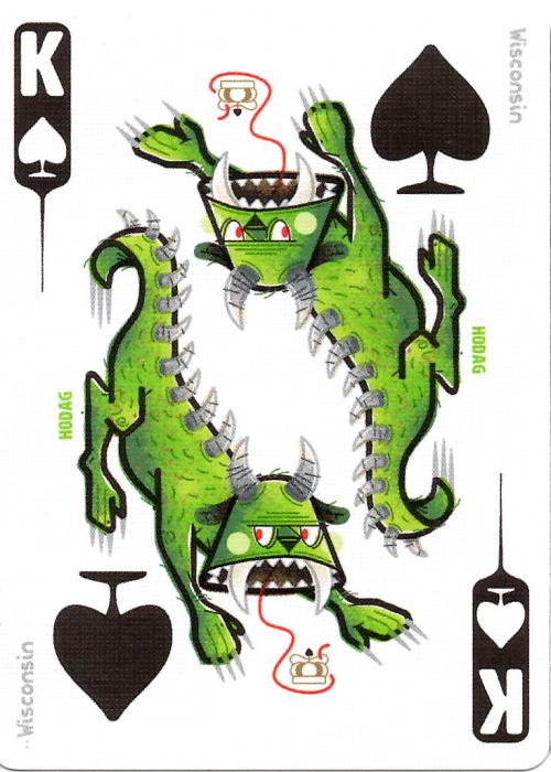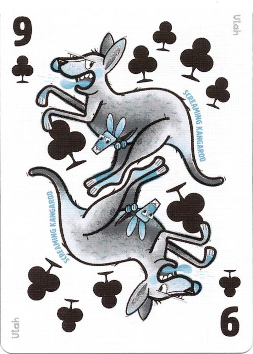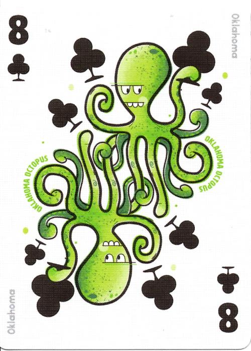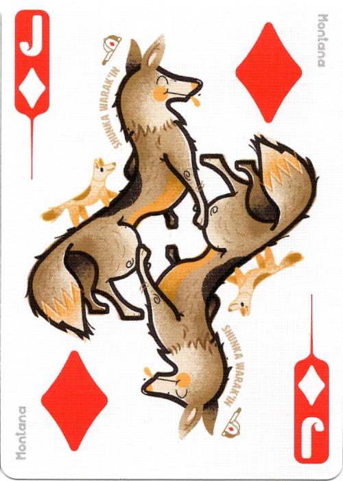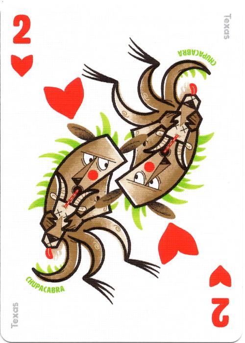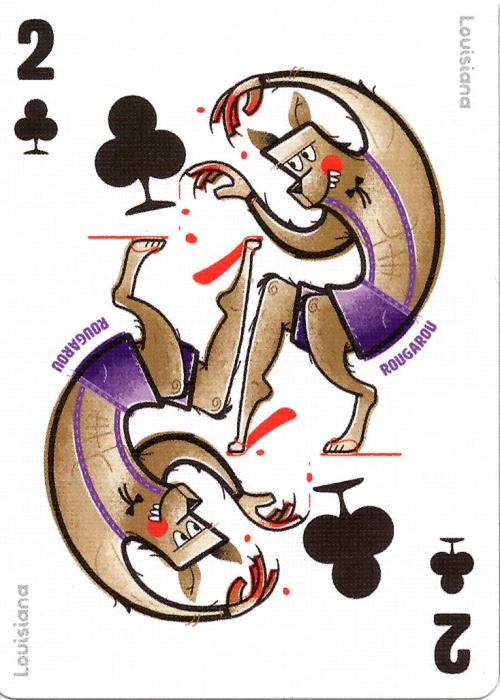 A lovingly illustrated poker deck of 54 cryptids from North America, representing all 50 United States and parts beyond. Each cryptid illustration is named and placed by state, rendered in bold color, and playfully arranged among the pips. Decks come in a die cut, handmade, 80lb cardstock tuck box stamped in gold ink and wrapped in twine; reminiscent of a field journal filled with illustrated identification cards.