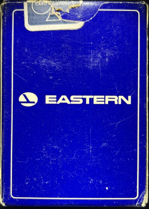 Dark blue variant of pre-existing Eastern Airlines deck, also with back seal. Although deck is of indeterminate age, the flap has the traditional long tongue common to older decks. Printed by USPCC in Cincinnati, OH.