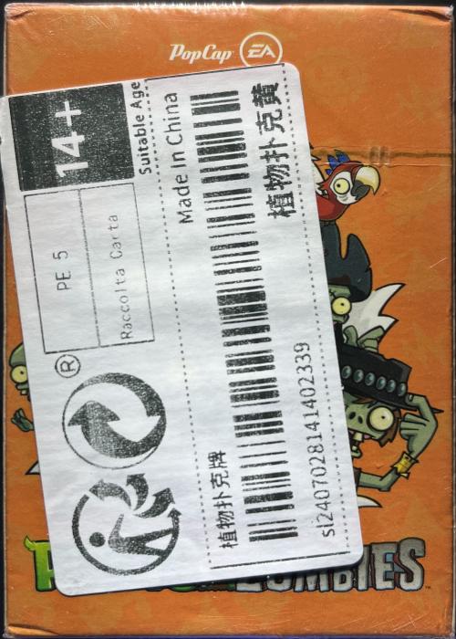 Chinese made deck, appears to be licensed by EA/Popcap, but potentially counterfeit. Interestingly, the declaration sticker is on the front of the tuck (tuck flap slot is usually on the back of a deck), although a large, easily defined picture is on the back of the tuck. As the front of the tuck is unrecognizable due to the declaration sticker, the back of the tuck has been loaded as the front, and the front as the back of the tuck. Google translator states in one area, “plant poker yellow”, so other color variants may exist.