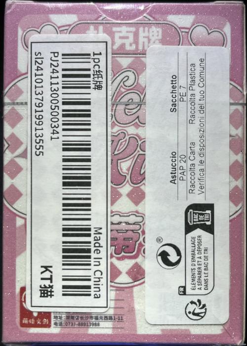 Chinese printed deck. Google translate states, “playing cards”, “Hello Kitty”, and “Glossy oil craft” in the text across the top, middle, and bottom of the front tuck. Side of tuck states “54 pcs”, so it can be assumed jokers are included.