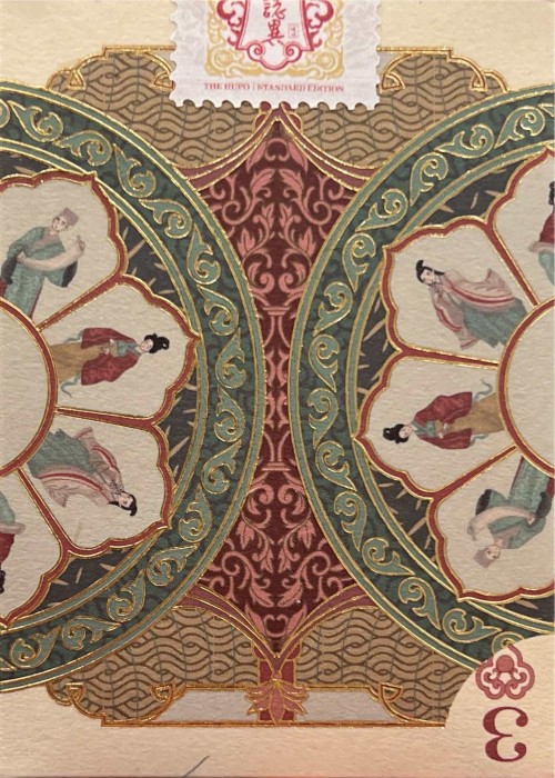 The Strange Tales From A Chinese Studio Playing Cards draw inspiration from the eerie and enchanting tales of Liaozhai Zhiyi (聊齋誌異), a 18th-century collection of supernatural stories where the boundaries between the human world and the spirit realm blur. Compiled into 491 chapters by Qing Dynasty scholar Pu Songling (蒲松齡), these stories weave together ghostly romances, fox spirits (huli jing 狐狸精), and moral fables, reflecting the tensions between Confucian ideals and the mystical undercurrents of Chinese folklore. The Standard Edition features the Scorched Tuck Box; the front side of the box has a big shaped hole which is patched with a colored paper from the interior of the box. Inspired by the revered tradition of Chinese thread-bound books, this tuck box is a modern homage to ancient printing and literary craft. Its design echoes the delicate paper and woven binding that protected some of history's greatest stories, including the manuscripts of Pu Songling's own era. The cards are all standard in every way. The Back design features a full-bleed borderless artwork which can animates when the cards are riffled, as well as making a great visual card fanning. The Number Cards features connecting puzzle that features the characters of the Strange Tales. The Courts also feature the characters, yet within intricate framework and as two-way illustration. The Jokers are a diptych illustration of the wheel of characters. (HUPO 琥珀) is the archaic descriptions of the colors of Gold and Amber, hence the color scheme of Red and Gold.