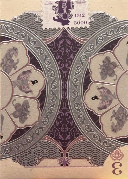 The Strange Tales From A Chinese Studio Playing Cards draw inspiration from the eerie and enchanting tales of Liaozhai Zhiyi (聊齋誌異), a 18th-century collection of supernatural stories where the boundaries between the human world and the spirit realm blur. Compiled into 491 chapters by Qing Dynasty scholar Pu Songling (蒲松齡), these stories weave together ghostly romances, fox spirits (huli jing 狐狸精), and moral fables, reflecting the tensions between Confucian ideals and the mystical undercurrents of Chinese folklore. The Special Edition features the Paper Fan Tuck Box; the front side of the box features a folded paper fan which can unfolds a medley of characters from Strange Tails. Meticulously crafted with luxurious foil and embossing that evokes classical Chinese artistry, it is the perfect blend of ethereal beauty and timeless folklore. The cards have special features such as cold foiling on the artwork details as well as patterned edge print on the side of the cards. The Back design features a full-bleed borderless artwork which can animates when the cards are riffled, as well as making a great visual card fanning. The Number Cards features connecting puzzle that features the characters of the Strange Tales. The Courts also feature the characters, yet within intricate framework and as two-way illustration. The Jokers are a diptych illustration of the wheel of characters. (GAOYU 縞⽻) is the archaic descriptions of the colors of Silver and Grey, hence the color scheme of Purple and Silver.