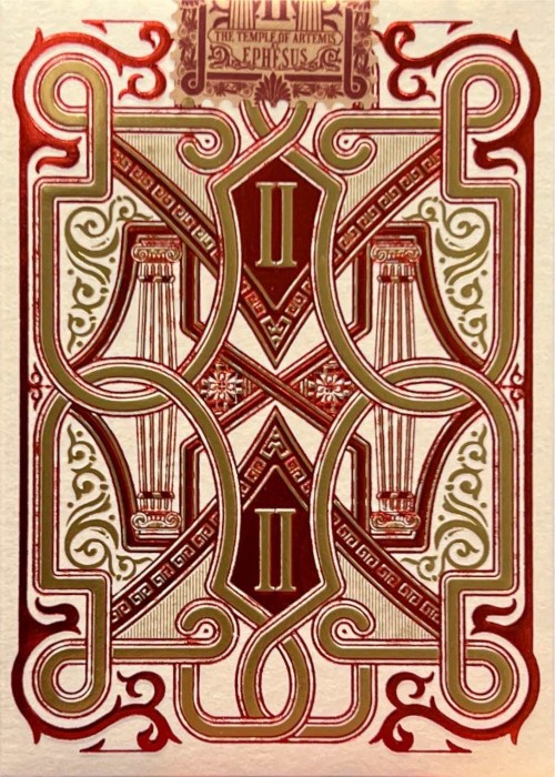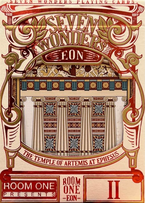 Step into a magnificent sanctuary that was said to have humbled even Alexander the Great with this exquisite deck of playing cards. A tribute to the awe-inspiring Temple of Artemis. More than a deck, this is a reconstructed piece of ancient splendor, channeling the majesty of the marble columns that once reached for the heavens. We’ve captured the temple’s legendary essence in every detail. Intricate illustrations and radiant gold accents mirror the famed sculptural reliefs that adorned the sanctuary. Each card is etched with motifs inspired by the intricate ionic columns and sacred motifs, inviting you to hold a fragment of its monumental beauty in your hands. The allure of the Seven Wonders is captured in the Die-cut Window Tuck Box, a centerpiece of this release. A window is punched out of the embossed and hot-foiled tuck box, allowing us to peer into days past, where the Temple of Artemis at Ephesus takes center stage as our 55th custom face card. The Number Cards feature subtle and intricate detailing which enhance each card's dimensionality, with bold pips which pop on the cards with their non-traditional placement. A medley of Greek deities is rendered in their own two-way court illustrations, backed by subtle and intricate detailing that enhance each card's dimensionality. All of the Courts feature the mighty Olympians. The Card Backs feature an interlinking motif and interweaving stairs that echo the intricate and complex nature of the Temple of Artemis at Ephesus.