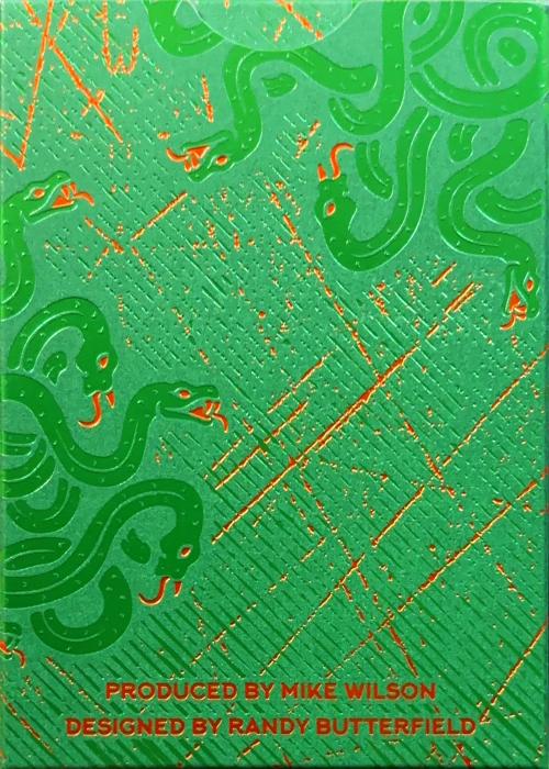 Inspired by Greek Mythology, the Medusa Deck has a mesmerizing Back design of green and orange snakes. Printed on a Holographic Foil material. Two tuck boxes: black or green, but both have the same cards inside. The green version was a Kickstarter Exclusive.