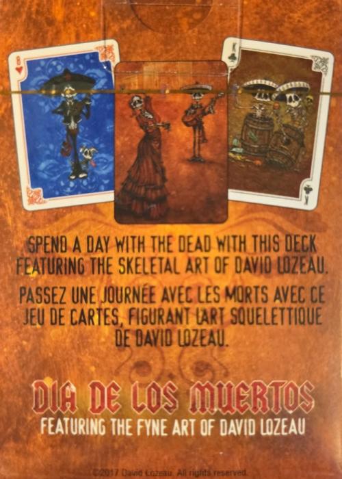 Back of box: "Spend a day with the dead with this deck featuring the skeletal art of David Lozeau."
