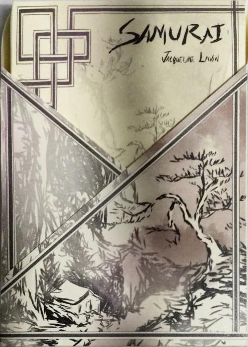 Handmade deck of a Samurai motif. Each card is drawn by the artist Jacqueline Lavin. This version is ultra-rare comprised of 14 printed decks, hand-cut decks by Ms. Lavin herself. The tuckbox has the same artistry, but is larger in size than the professionally manufactured 100 decks, as the hand printed cards are thicker than the 300 gsm smooth card stock. There is another second professionally printed version of 100 decks printed and distributed using 300 gsm smooth card stock.