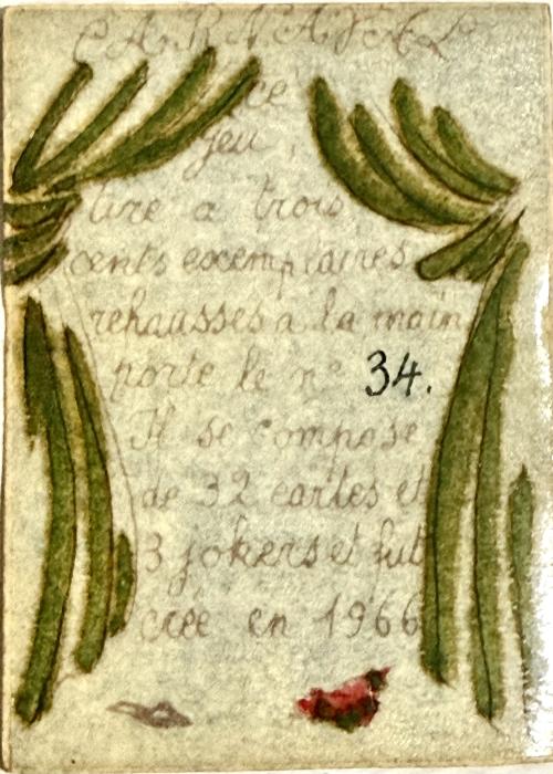 This specific hand drawn deck has 32 cards, plus 3 jokers, plus 1 title card for 36 cards total. Extremely rare in complete form and all hand made.