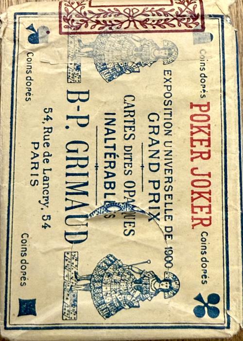 B-P. Grimaldi 1900 Exposition Universelle De 1900 Inalterables (1900 World Fair). 1890 Tax Stamp. 1900 Publication. 1853 Jack of Clubs shield. Gold Gilded Corners 1 Joker Poker Card 53 Cards Total Original Deck - not a reproduction