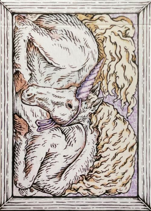 One of the possible 54 animals which to be pulled from the Blind Mystery Deck from Zoo 52 series. White Horse - A white horse wearing a fake horn to disguise as a unicorn, horizontal illustration From an unknown space, we arrive at an unknown paradise. Lunzi brings you a brand new chapter—Zoodeck Here, each deck is an independent life story, together weaving an infinite dimension of nature and existence. Zoo 52 consists of 54 images of animal wonders, magnifying the "aesthetics of texture" on paper. Most of the works focus on the upper body or torso of the animals, magnifying the texture of fur, wings, scales and skin to transform the texture of life into a perceptible visual language. Zoo 52 is not only an animal art encyclopedia, but also a ticket to nature—leading you into a secret realm where wildness and aesthetics intertwine, embarking on a journey of unexpected encounters with the origins of life. A painting made with the same sincerity as always: The entire process was completed by hand with a dip pen, capturing the animals' most authentic state with delicate brushstrokes and ingenuity: their fur and scales, their diet and habitat, their seasons, birth and growth... Each line carries the creator's inspiration and breath, condensing into a tangible warmth.