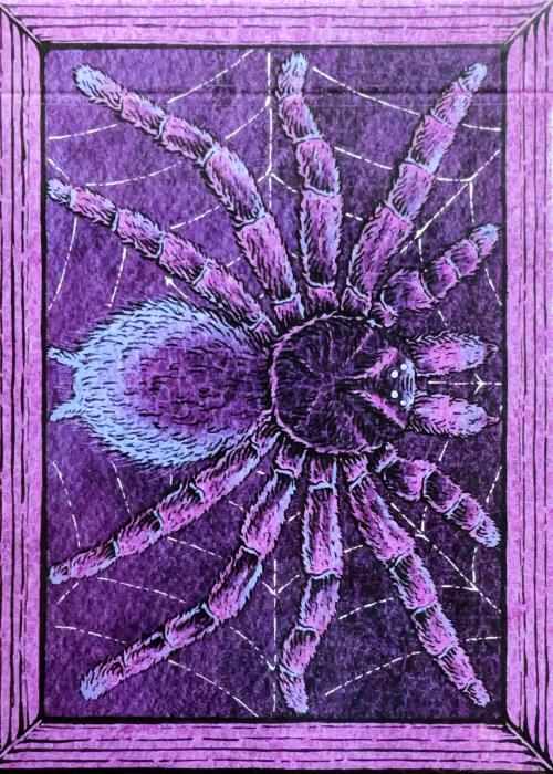 One of the possible 54 animals which to be pulled from the Blind Mystery Deck from Zoo 52 series. Spider - A purple tarantula on a web, horizontal illustration From an unknown space, we arrive at an unknown paradise. Lunzi brings you a brand new chapter—Zoodeck Here, each deck is an independent life story, together weaving an infinite dimension of nature and existence. Zoo 52 consists of 54 images of animal wonders, magnifying the "aesthetics of texture" on paper. Most of the works focus on the upper body or torso of the animals, magnifying the texture of fur, wings, scales and skin to transform the texture of life into a perceptible visual language. Zoo 52 is not only an animal art encyclopedia, but also a ticket to nature—leading you into a secret realm where wildness and aesthetics intertwine, embarking on a journey of unexpected encounters with the origins of life. A painting made with the same sincerity as always: The entire process was completed by hand with a dip pen, capturing the animals' most authentic state with delicate brushstrokes and ingenuity: their fur and scales, their diet and habitat, their seasons, birth and growth... Each line carries the creator's inspiration and breath, condensing into a tangible warmth.