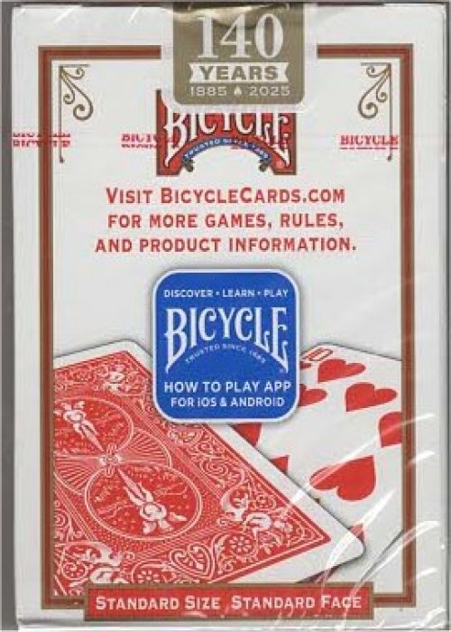 Standard Bicycle deck in red, 140 Years tuck seal. Released in 2025, copyright of deck is 2021.