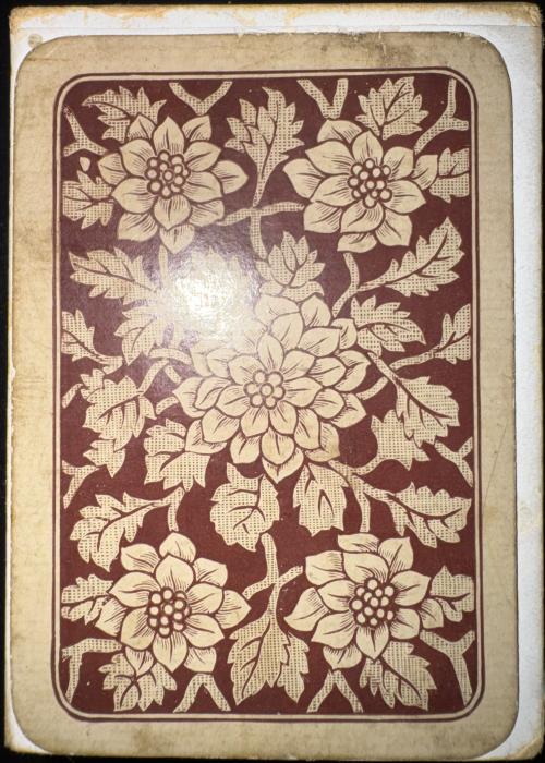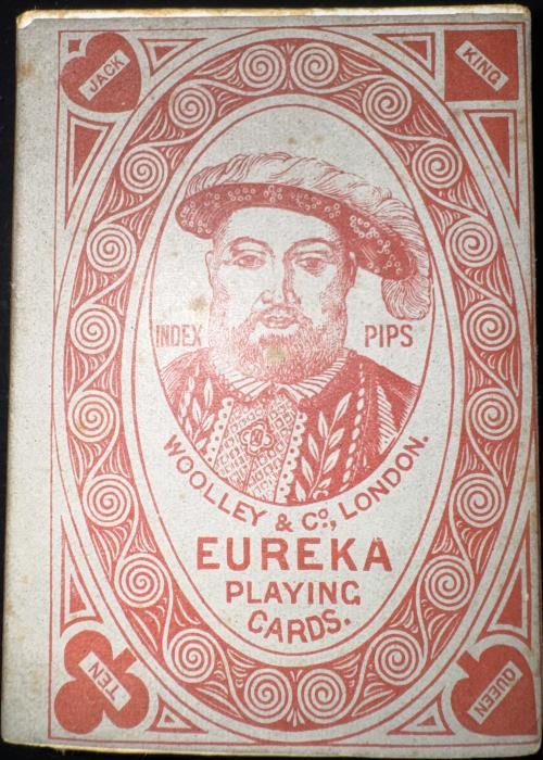 Woolley & Co “Eureka” playing cards with rounded corners, small index pips and decorative back designs, c.1880-1885. Packs with corner indices, along with rounded corners, had been introduced by Woolley & Co as a novelty around 1878-79 and were sold at that time for one shilling per pack. Woolley also took pride in publishing new artistic and eye-catching back designs each season, in several tints, which were inspired by fashion trends of the day. These features, along with enamelled surfaces and competitive prices, were aimed at increasing sales.