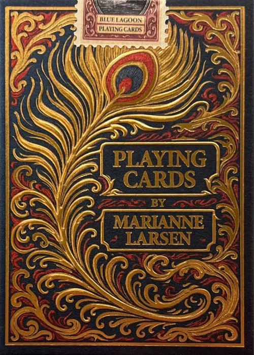Thalassic unfolds the old, Oceanic tale of the Green Galleon, an enormous ship loaded with gold and rare, blue sapphires, that sank in shark territory, off the coast of the Blue Lagoon. On this tropical island, the most extraordinary peacocks are spotted with gold coins in their beaks, shaping rumors that making friends with these exotic birds is the only way to navigate towards the endless riches. Many have tried, all have failed. There's even a port pub that has been raised and named on the mysterious legends of the sunken treasure. Here, experienced sailors gather to share secrets of it's existence and location. In Thalassic, four naval crews are about to embark on an adventure far greater than the ocean itself. What awaits ahead is a mystery and journey even richer than the treasure they all set out to find! Thalassic is my latest and greatest playing cards project once again in collaboration with talented artist Martin Helgren. A whole new theme and tale, told with two completely unique editions - my first ever metallic gilded blue/green decks - produced with many exquisite features of refined elegance and with intricate illustrations. Do not wait - adventures await those who dare to board the ships! Blue Lagoon features blue color scheme deck. The tuck features the beautiful peacock and its feathers. The cards feature more beautiful artworks on the front side and full-length courts. The back design is a one-way, full bleed borderless artwork of feathers. Also, the cards are gilded in sapphire blue.