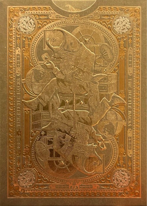 The Beetle Backs, presented by The Gentleman Wake and designed by Widakk Design, is the culmination of a two-year long effort to create a deck of cards perfect for Collectors, Players and Magic Enthusiasts everywhere. Classic and beautiful, evoking turn-of-the-20th-century style and elegance and the finest modern handling and playing card printing techniques, The Beetle Backs also tells the Kafkaesque tale of an embattled entomologist deep in study of his chosen field; the Dynastinae subfamily of scarab beetles. For Players, Collectors, and Magic Enthusiasts, The Beetle Backs is a masterwork collection of Decks and Accessories; a perfect union of classically inspired illustration and modern design, masterfully realized with the absolute highest quality materials and attention to detail. Featuring cards with exquisite handling and linen finish, adorned with pantone inks and, in a some cases, cold foil. The decks are packaged within premium tuck boxes emblazoned with as many as three foil layers and deep embossing. Limited to 1500, The Beetle Backs Legacy Edition features a gorgeously embossed tuck case with 3 tones of gold foil pressed on the highest quality 310 gsm cardstock. The cards within are gold gilded and include a classic mirrored back design adorned in beautiful gold cold foil and metallic ink, contrasting with a deep black background. The faces of the cards are also printed with gold cold foil. Black and gold cold foil border upgrade is also added in! A true collectors item that will amaze at the card table or on the shelf.
