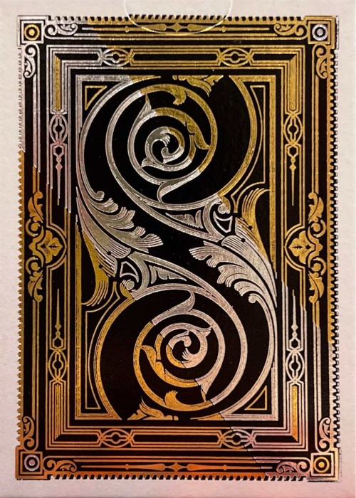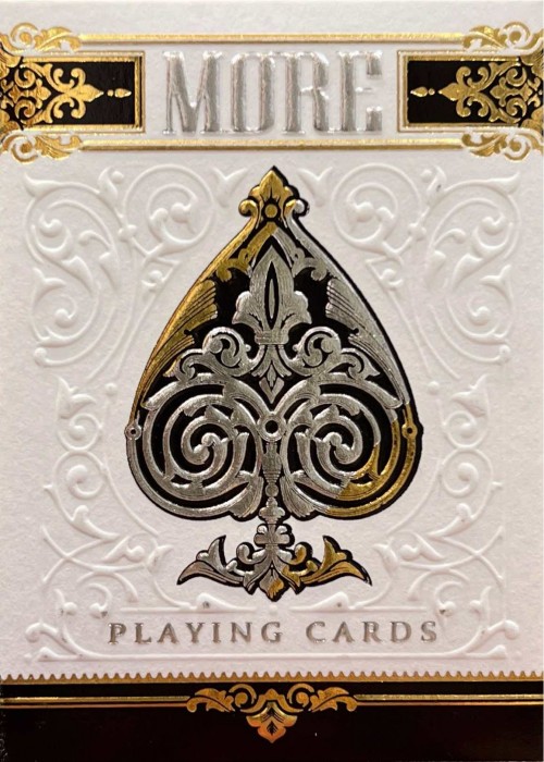 Introducing MORE Playing Cards, a remastered version of LESS Playing Cards. For this deck, the design adopts from LESS, and they're expanded into MORE - the back design is expanded, which the colors of silver and gold clashes. The artworks are more refined than before, especially the Courts as well as the borders. MORE PLAYERS features tuck box made of white matte stock with black, gold and silver foils with blind embossed pattern. The cards are printed on black core stock with gold and silver metallic inks on both sides. PS: Disregard the number of decks on the bottom of the deck.