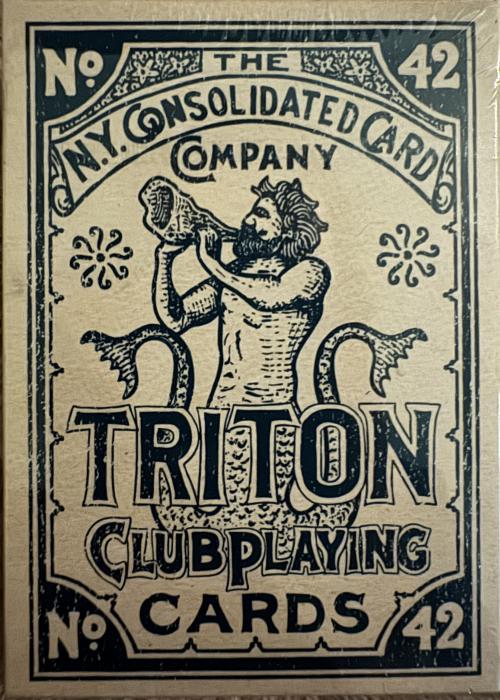 A restoration project breathing life into a classic deck of cards first printed over a hundred years ago by the New York Consolidated Card Company: Triton No. 42 Club Playing Cards - first produced around the year 1890, the Triton No. 42 Club Playing Cards were a premium player's deck, intended for use in high-end games rooms and homes, and were marketed as having the perfect slip and being double-enamelled for superior quality and handling.