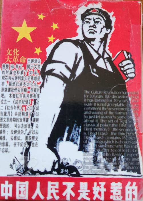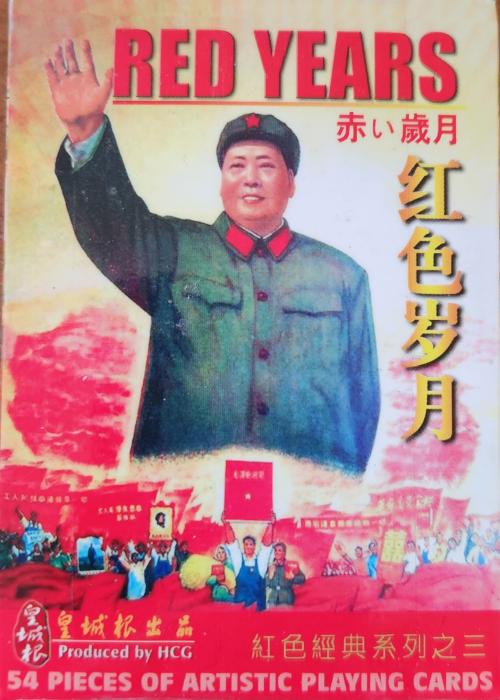 Red Years Unique deck about the ChiComs (Communist Chinese) and Mao Zedong and the little red book. It is a deck of communist propaganda. There is a plastic case inside of the cardboard box. Each card is different, usually a soldier with a gun and red book, or someone working in glorious tractor factory with the red book. Found the deck at a thrift store.