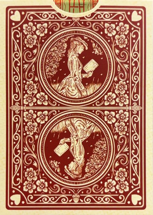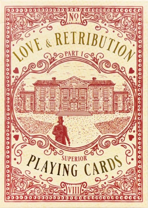 Love & Retribution Part 1 Playing Cards in a deep, elegant red with classic styling and glistening gold foil elements on the tuck. This deck is inspired by the first half of the story, in which Sarah and Henry meet and fall in love against all odds and to the disapproval and contempt of Sarah's father, landowner George Fairhurst. The deck is illustrated throughout with painstaking hand-drawn characters and details and features fully custom artwork and design elements at every turn, while maintaining the roots of a classic deck of playing cards every bit as functional as it is pleasant on the eye. For a touch of luxury, deck one is also available in a glossy gold gilded variant, and will feature a gold sticker seal on the tuck. The shimmering gold matches the regal red to perfection.