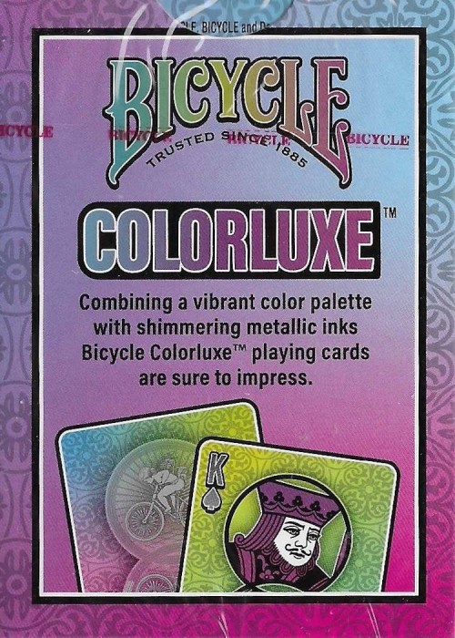 Introducing Bicycle Colorluxe. Each card in this exclusive deck features a rich color palette, with vibrant hues that beautifully contrast with shimmering metallic inks creating a mesmerizing shine that transforms traditional gameplay into a visually captivating experience. Whether you're hosting a game night or simply displaying them as art, Bicycle Colorluxe cards are sure to impress.