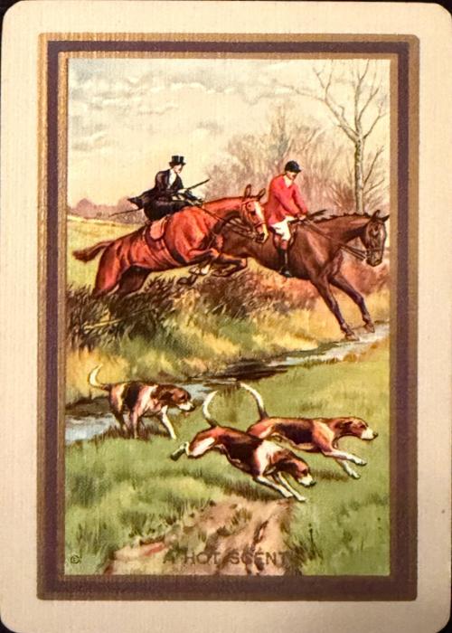 Part of the Narrow "Fox Hunt Series". Back design shows two hunter on horseback and 3 hounds on the trail of foxes.