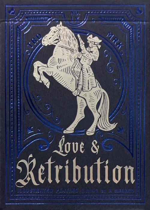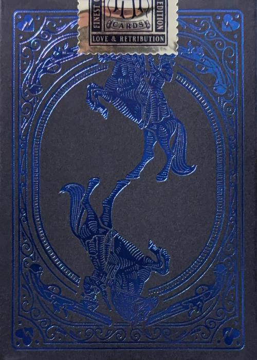 Love & Retribution Part 2 Playing Cards follow the course of the second half of the book, as Henry vows to find Sarah and confront George. This deck features distinct artwork on the tuck, Ace of Spades, card backs, jokers and heart court cards, while retaining the same overall set of custom faces as the first deck. The tuckbox is made from high quality matte card in midnight blue and features prominent silver foiling paired with subtle blue foil decorations displaying bold, iconic imagery. Perfectly matching the rich midnight blue of the back design, deck 2 is also offered in a luxurious silver gilded edition, with the gilt edges of the playing cards reminding of a highly polished dagger under the light of a full moon. A silver sticker seal completes the gilded edition.