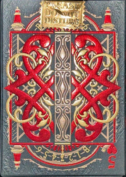 The Hotel Fur Elise Playing Cards are a tribute to the haunting tales of lost souls and forgotten tragedies. Where vengeful spirits linger, forever trapped in the moment of their demise. Inspired by the tales of haunted houses. These decks blend the hotel’s lavish, early-century aesthetic with the unsettling stillness that followed the breach. Ornate patterns frame glimpses of the tragedy, turning each card into a piece of the grand, terrible spectacle that now forever haunts its halls. An eternal servant of the hotel is stationed sentinel on this case. With a tilt of the box, the lenticular print shifts, and the spectral porter comes to life. His hollow grin following you, one hand eternally bound to the control lever. Handle his image and feel the chill of his unfinished duty.
