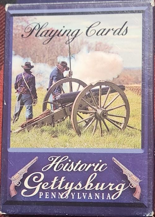The box features artwork of two Civil War soldiers with a cannon, alongside the text "Playing Cards" and "Historic Gettysburg Pennsylvania" flanked by two revolvers.