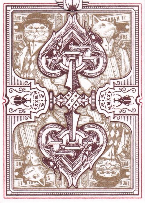 The Parlour Royale (Patronium) was part of the 2025 S17 Patreon Annual Reward. The cards have a different layout, and for this variant the Ace of Clubs is the protagonist, featuring Nick Nixie. The tuckboxes were printed with letterpress on cotton paper in Italy by Boschiero&Newton and the cards feature silver foil on the back tinted in aquamarine, gold foil on the front, and gilded edges with translucent aquamarine.