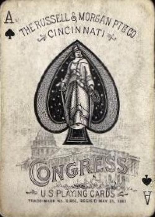 Congress "Starlight" lacquer back. This deck is special because it is of the 404 variety, meaning plain edges. Decks with plain edges are exceedingly rare and difficult to determine. This one has been confirmed via high magnification to see if there were any traces of gold. There were not. Box has R&M logo stamped in silver ink (606 used gold ink), making this box original to the deck.