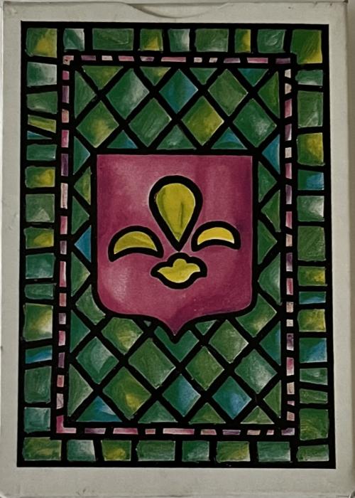 Court cards (K,Q,V) are colourfully illustrated in the style of stained glass windows. Aces and pip cards are standard design.