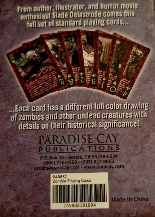 From author, illustrator and horror movie enthusiast Slade Delastrode comes this full set of standard playing cards, each card has a different full colour drawing of zombies and other undead creatures with details on their historical significance!