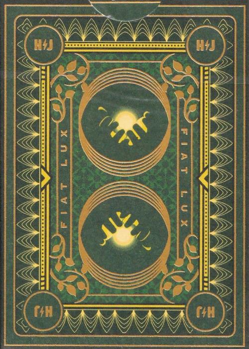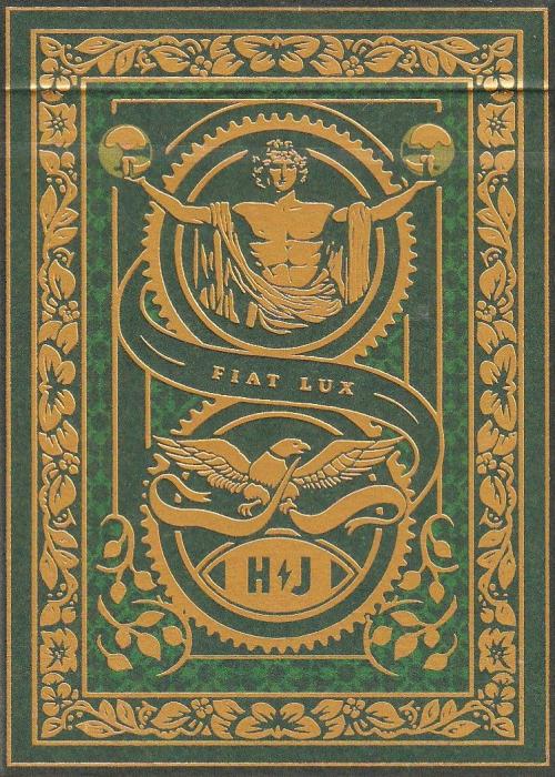 Privately commissioned project, Printed by USPCC on premium stock and not being released to the public outside of Kickstarter. "The deck draws on design elements from the turn of the 20th century: a golden age of science and invention. The card back is based on the Greek myth of Prometheus who defied the Olympian gods by stealing fire from them and gifting it to humanity - an analogy for the gift of progress and enlightenment. The latin “Fiat Lux” means “Let there be light” - in this case the light of science and reason. Light (and its absence) are referenced heavily throughout the deck. The court and number cards are inspired by art deco / art nouveau poster art and metallic sculptural forms. Each court card is the personification of an aspect of science and industry." - Sinecure