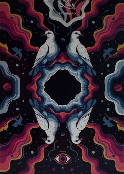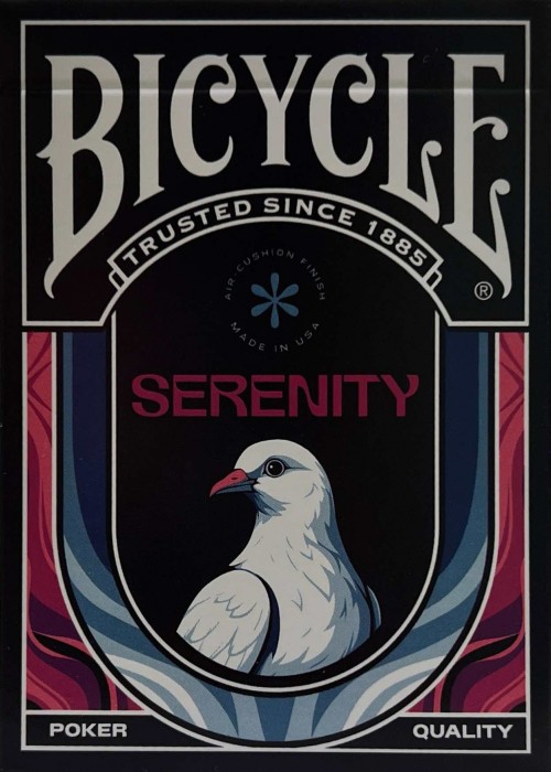 Seek peace throughout the chaos. Printed by the United States Playing Card Company, these cards handle like a magician's dream! They're soft, snappy and durable while being great for sleights and cardistry. Premiuim Thin Crushed Stock with Air Cushion Finish Two-Way Back Design Borderless Custom Pips Jokers with Reveal Recolored, Standard Courts Double Backer + Gaff Card The deck features the Bicycle branding on the deck. Artwork is done by Destino.