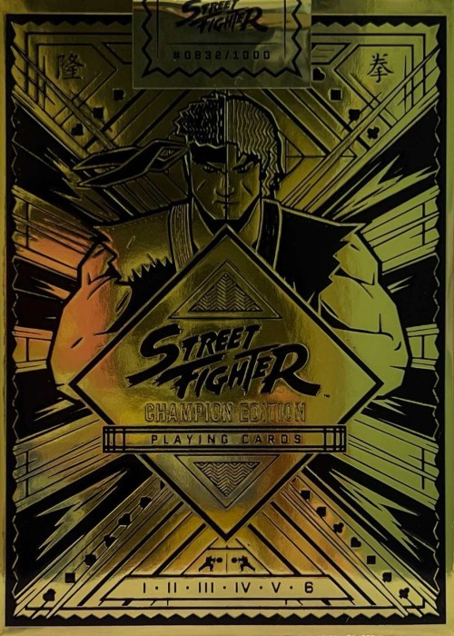 For the Street Fighter loyalists and franchise fanatics, we've created a special Edition of the deck - Street Fighter Champion Edition; only 1000 decks, etched in gold. Encased in our most luxurious box yet, each face card has a bespoke character illustration finished with shimmering gold details. Deep black line works pops against a golden film - In its reflection, you'll find a true champion, worthy of the prize. The full deck includes your favorite fighters: Aces - the prominent fighters in the series Spades - Ryu Hearts - Ken Clubs - Luke Diamonds - Akuma Kings - the four highest-ranking and deadliest members of the syndicate Shadaloo Spades - Sagat Hearts - Vega Clubs - Balrog Diamonds - Bison Queens - the toughest female fighters Spades - Cammy Hearts - Chun-Li Clubs - Juri Diamonds - Kimberly Jacks - more fighters, still tough in their respective style Spades - Guile Hearts - Zangief Clubs - E.Honda Diamonds - Dhalsim Jokers - last but not least, another prominent fighters A - Blanka B - Dab Other key features include: Premium Casino Standard Cardstock: Manufactured using top-grade black German core paper and finished with a premium linen texture, these cards offer superior durability, handling, and a satisfying shuffle. Perfect for both serious card players and collectors. Versatile Gameplay: From game nights to display shelves, these cards are crafted to serve multiple purposes—play, admire, or showcase. For Street Fighter fans, they're more than cards—they're a slice of the action in your hands. Details: Brand: Dyenamik Limited Edition with numbered seal, only 1000 ever made Premium Casino Standard Black German Core paper High-quality embossed foil box Premium linen finish on the cards 330gsm - artworks feature metallic gold cold foil