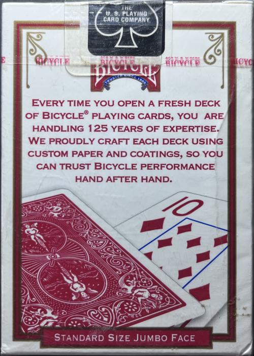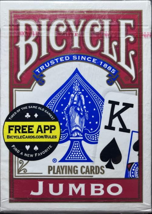 A Bicycle Jumbo red variant. This example is copyrighted 2013 and has the full circle “free app” on the front tuck, as opposed to some variants with the circle half on the front and half on the side of the tuck.