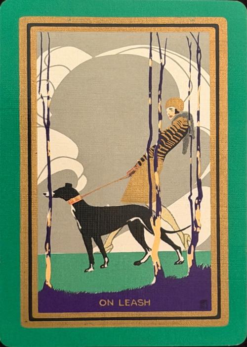 Art Deco style back featuring a woman walking her dog. Often paired with "Promenade", this back design was printed from around 1929 until the 1990s.