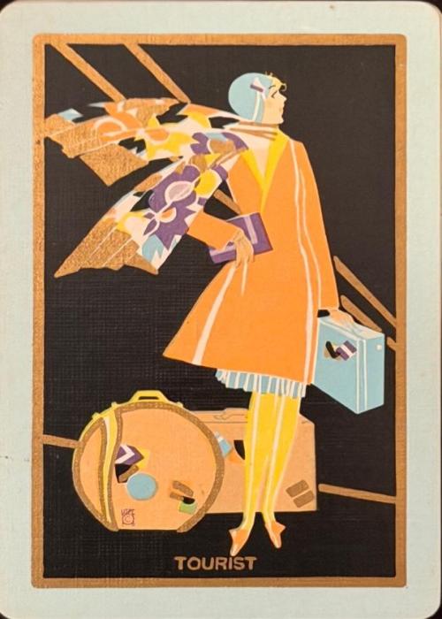 Art Deco design featuring a woman in a coat with colorful scarf, and luggage by her feet